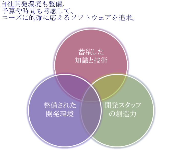個々のニーズを満たしかつ最も効率的な方法でソフトウェア化を実現するために、蓄積した知識と技術をフルに投入して開発にあたっております。また、自社の開発マシンによる疑似環境の構築力向上など開発環境の整備にも努力しております。社内における一貫生産制の確立を図り、生産性向上や品質・性能の高度化を推進しています。さらに開発スタッフに対しても技術的な管理だけでなく、人間工学に基づく品質・工程管理の在り方も研究しています。社員一人ひとりがフルに能力・創造力を発揮できる環境を整えております。